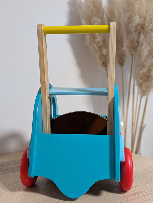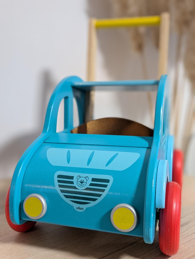 Jouet en bois, durable. Un incontournable pour découvrir le monde? Roues silencieuse, Très stable, Système anti-basculement, Développement de l'autonomie, Développement de la motricité corporelle.
