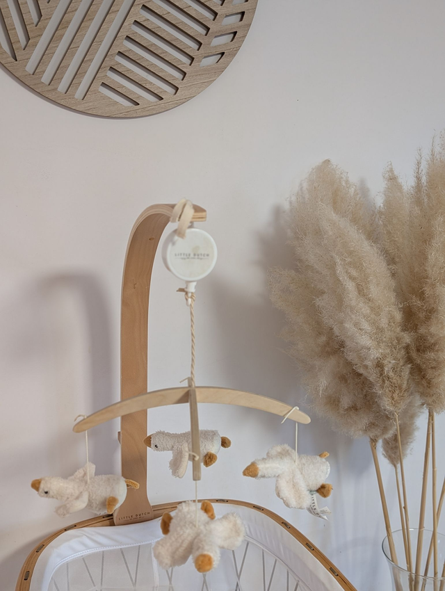 Ce mobile musical en bois tourne doucement et joue une mélodie apaisante qui aide à s'endormir. Les couleurs subtiles et les adorables figurines attirent l'attention et stimulent les sens.