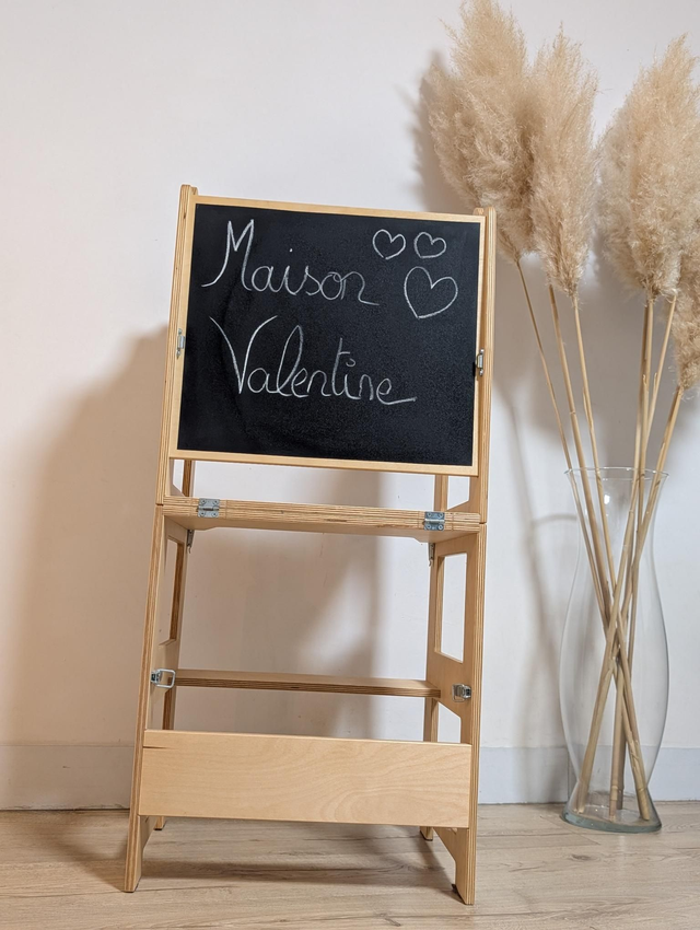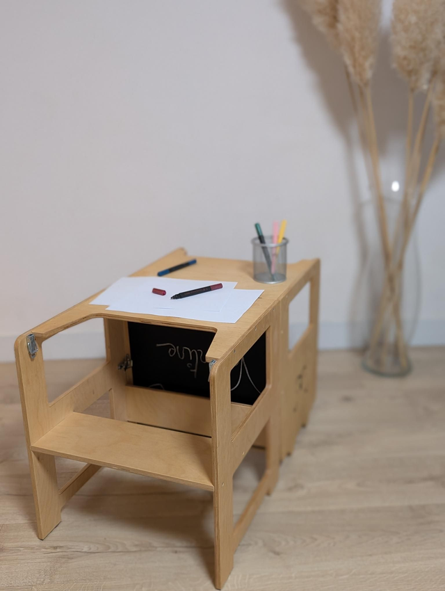 Tour d'observation Craffox, deux enfants peuvent s'asseoir dans la position table, equipé d'un tableau noir, facile à passer de sa forme de tour d'observation à celle de bureau avec chaise, le contreplaqué est certifié CE, PEFC et FSC, supporte en toute sécurité jusqu'à 70 kg.
