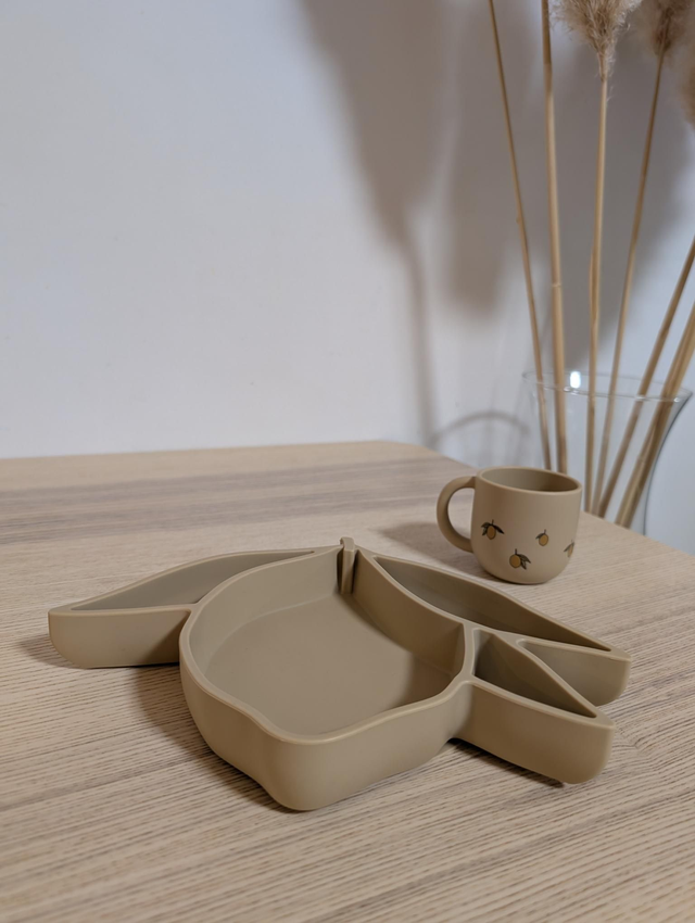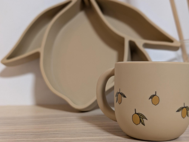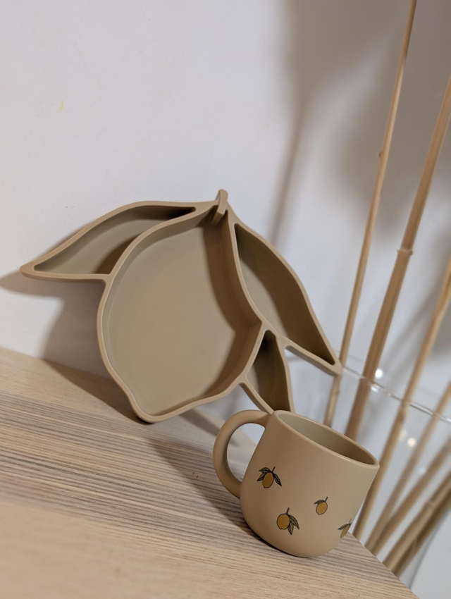 Bol et tasse en silicone 100%. Bol citron : H : 19 x L : 25,6 x P : 4,2 cm. Tasse en silicone : H : 6,5 x L : 6,8 x L : 9,3 cm.