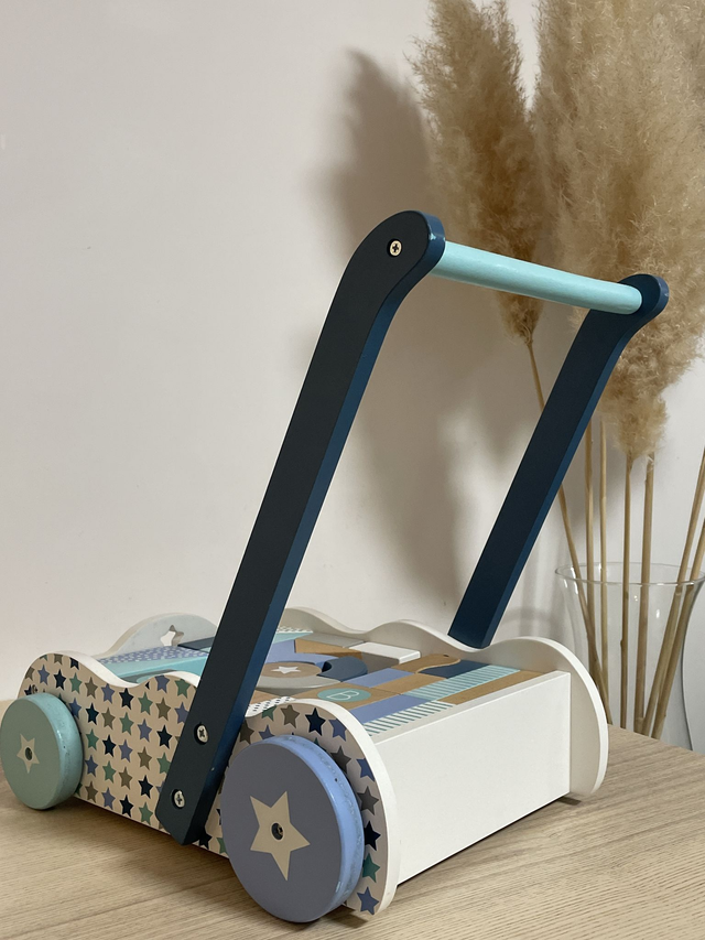 Ce chariot à pousser incite l'enfant à se déplacer et à explorer le monde qui l'entoure. L'enfant pourra également réaliser ses premières constructions avec les 27 blocs en bois colorés à transporter partout.