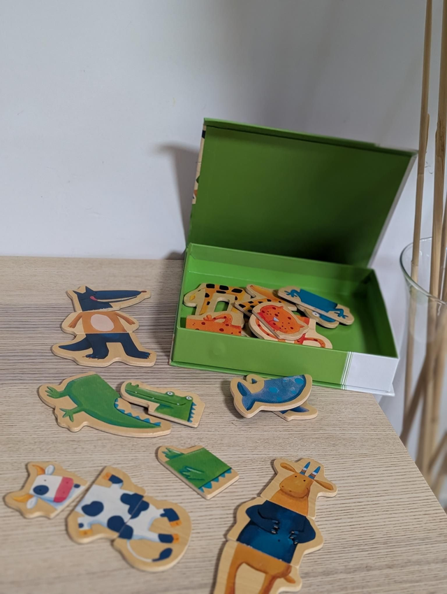 Le coffret contient 24 pièces magnétiques en bois permettant de créer 8 animaux de 3 pièces chacun. Votre enfant s'amusera à associer la tête, le corps et les pattes de chaque animal : une vache, un crocodile, une girafe, une grenouille, un loup...